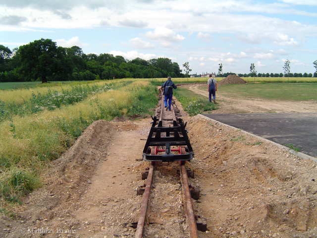 Nach einer Planungsphase begann an diesem Tag der Aufbau der Gleisanlagen. Der Untterbau besteht aus Kies/ Sand und Recyclingmaterial, anschließend ordentlich gerüttelt bietet er stabilere Auflage als manche originale Feldbahn. Schließlich soll es auch eine ganze Weile halten...